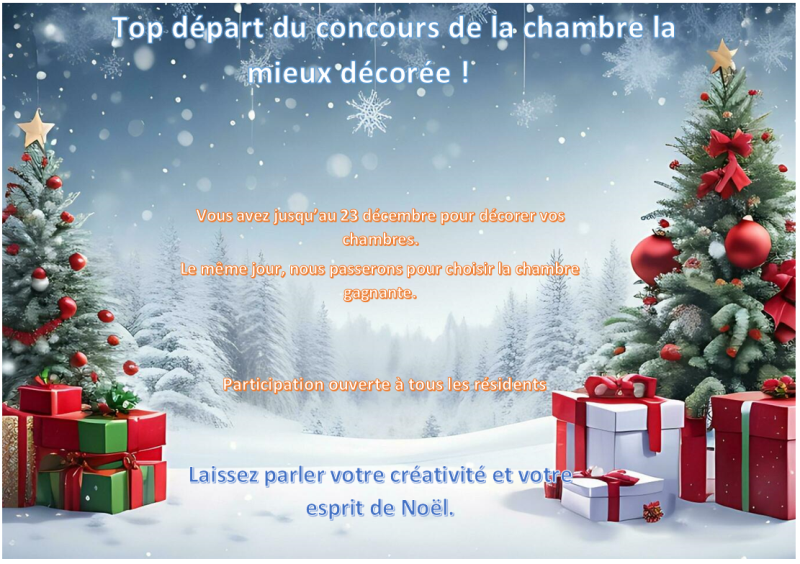 Le 23 décembre, notre jury de Noël passera dans chaque chambre pour admirer les décorations et élire le /la grand(e) gagnant(e) de cette édition.