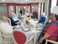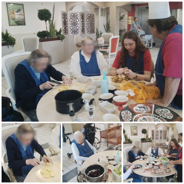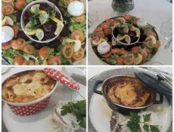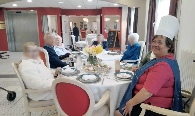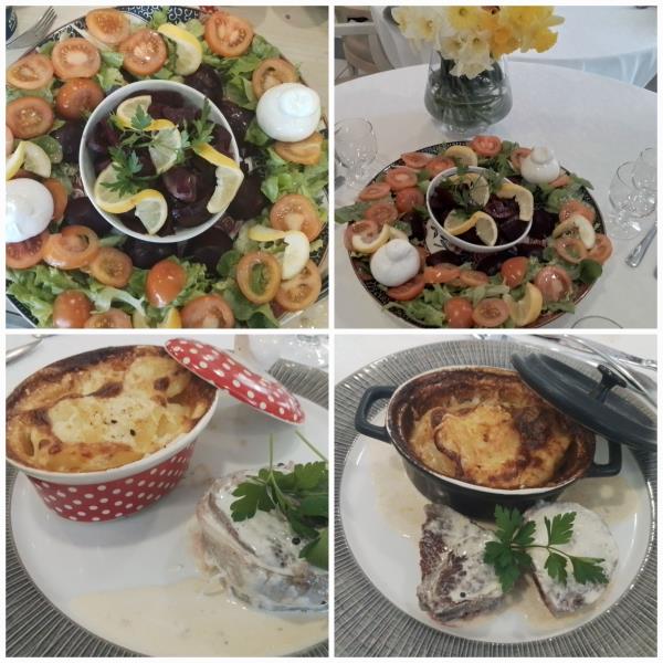 Ce midi, Sylvie a organisé une belle table d’hôte pour les résidents. 🌸 Au menu : en entrée, une salade printanière composée de betteraves rouges, burrata, salade et tomates fraîches. Pour le plat principal, un savoureux filet de bœuf flambé au Calvados, accompagné de son gratin dauphinois maison. Un vrai régal pour les résidents présents, qui ont d’ailleurs participé ce matin à la préparation du repas dans une ambiance conviviale et chaleureuse, avant de partager ensemble ce délicieux moment de dégustation. 🍽️